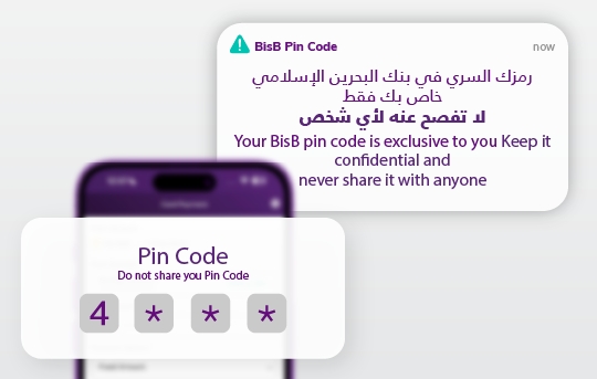 لن يطلب منك أي من موظفي بنك البحرين الإسلامي إدخال الرقم السري الكامل الخاص بجهاز الصراف الآلي عند تعيين الرقم السري الخاصة بك، احرص على حفظها والتخلص من إشعار التفعيل.