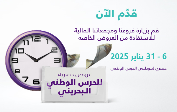 بمناسبة ذكرى تأسيس الحرس الوطني، يسر بنك البحرين الإسلامي (BisB) أن يقدم عروضاً حصرية للاستفادة من التمويل شخصي، والتمويل العقاري، وتمويل السيارات بمعدلات ربح مخفضة، بالإضافة إلى عروض على نقاط مكافآت الإسلامي لبطاقات فيزا الائتمانية. استفد من هذا العرض المميز المتاح قبل تاريخ 31 يناير 2025!